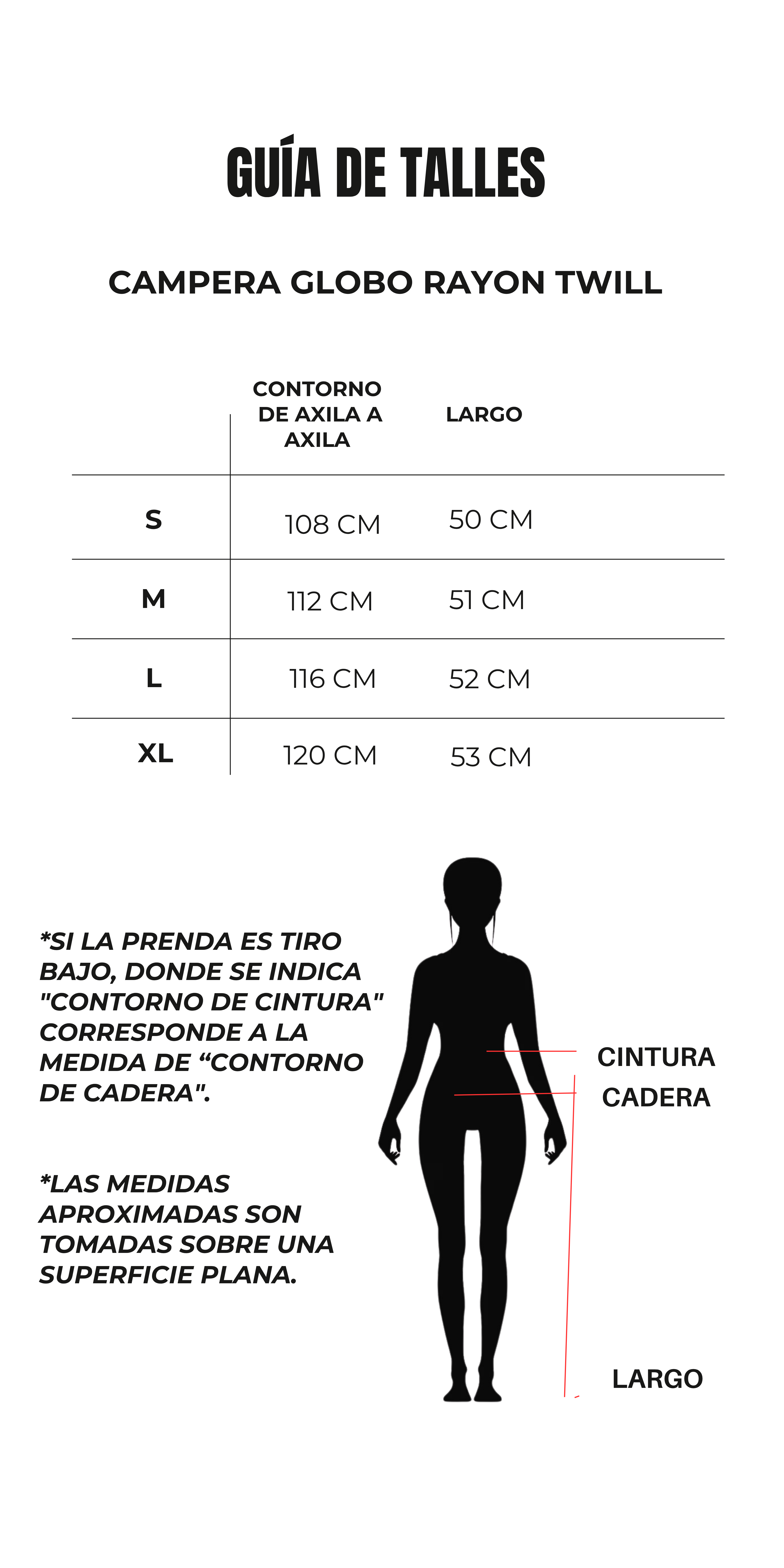 Campera Globo Rayon Twill: disponible en talles S al L y colores beige, marrón y negro. Perfecta para sumar estilo y versatilidad a tu guardarropa.