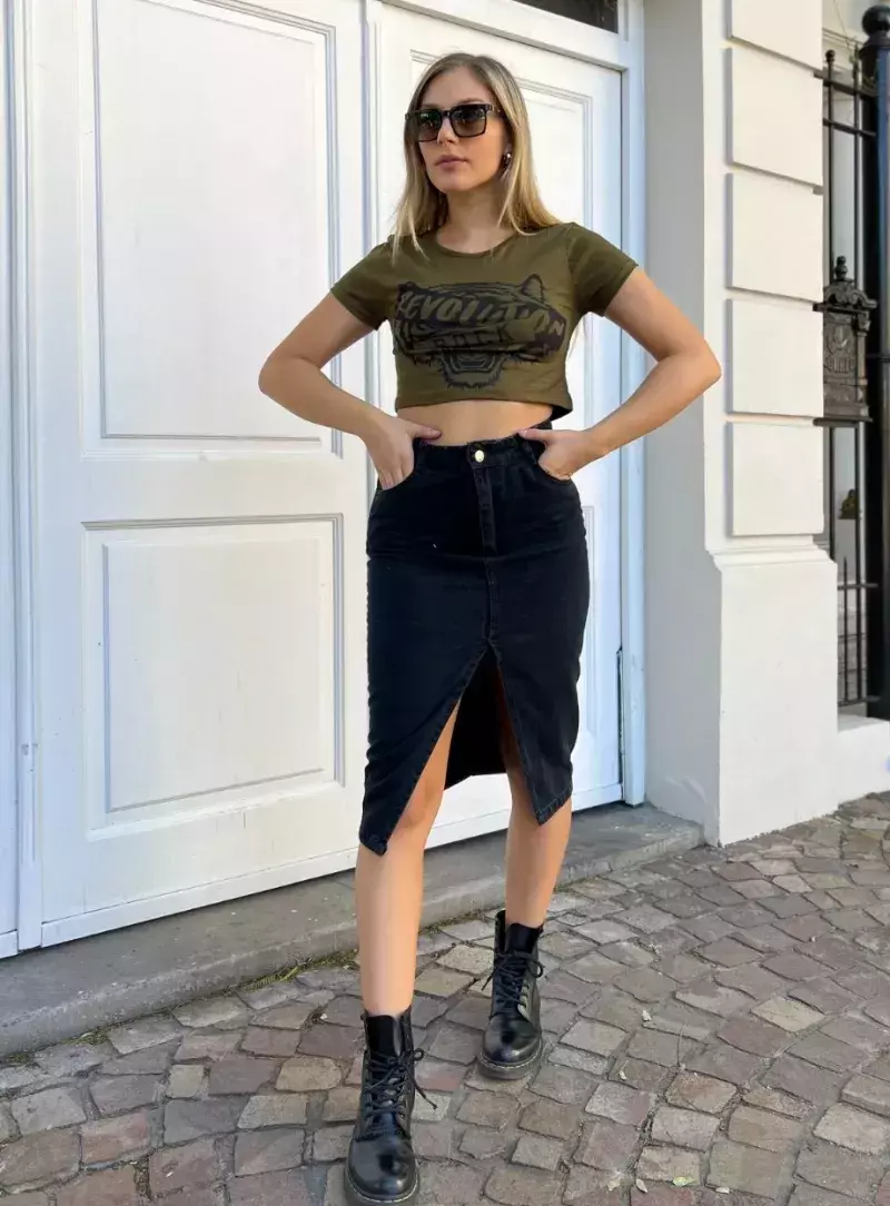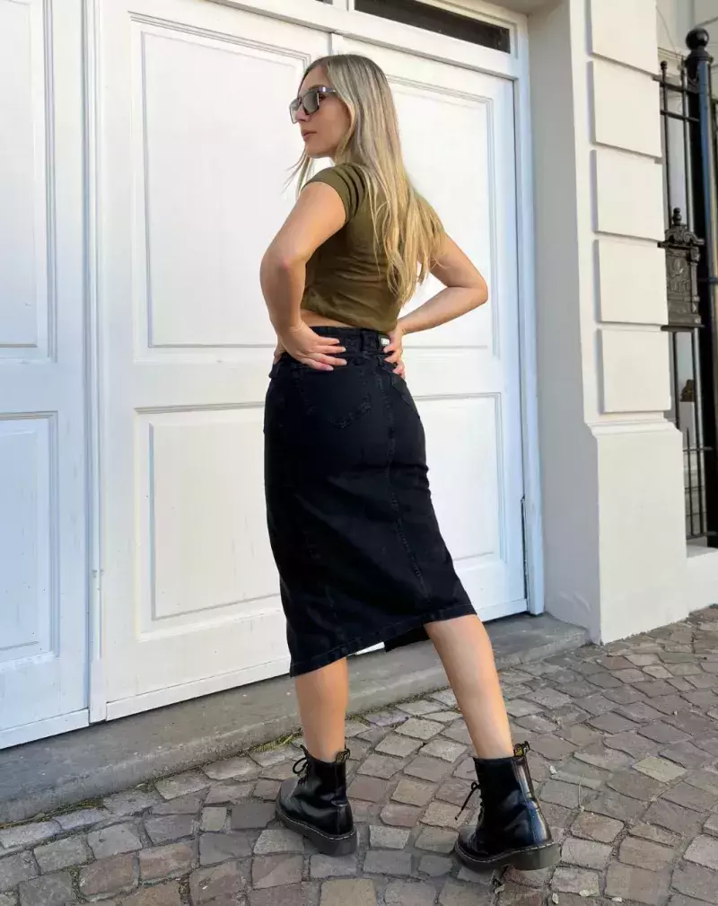 Pollera de jean midi con tajo delantero y roturas en la cintura