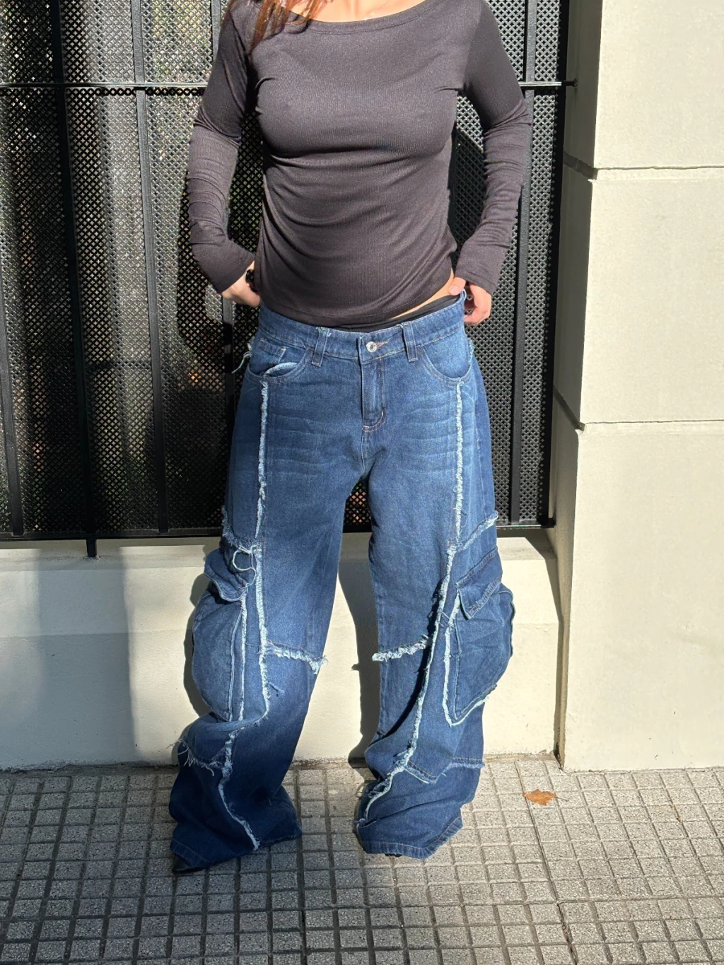 Descubrí el Jean Cargo DRAVEN de EMBRUJO: denim azul rígido, con flecos y tiro medio que realza tu figura. Su diseño cargo combina tendencia y funcionalidad, ideal para un look urbano y moderno.