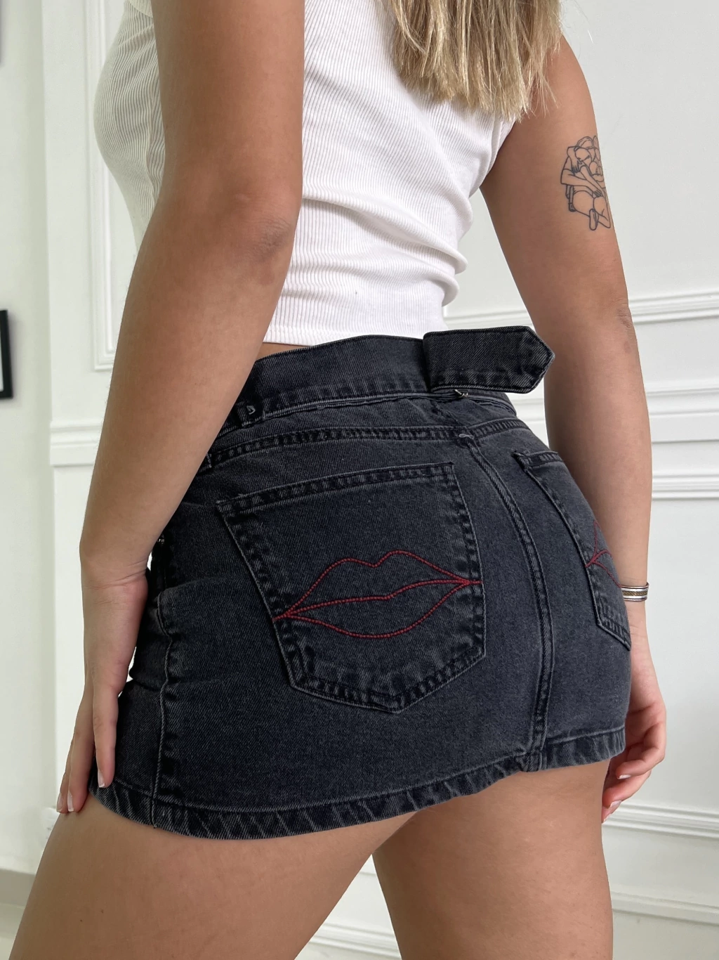 La Mini Bordado "Labios" es la opción perfecta para sumar un toque audaz y femenino a tu look. Confeccionada en denim negro, destaca por su bordado de labios, aportando originalidad y estilo propio. Disponible en talles del 34 al 46, se adapta a diferentes siluetas brindando comodidad y versatilidad.
