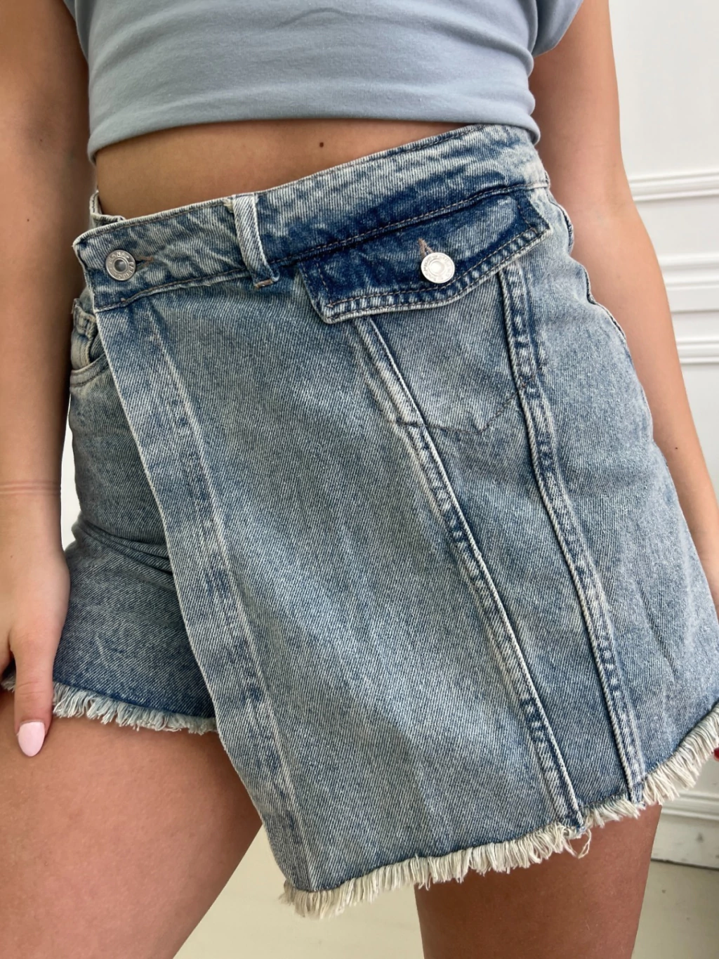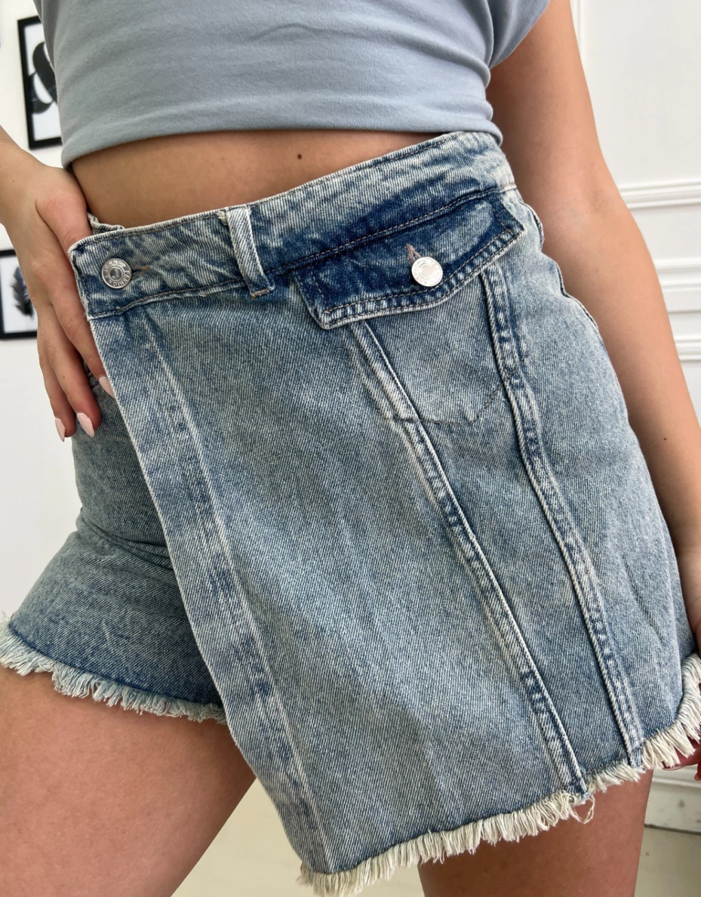La Short Pollera de jean rígido tiro alto EMBRUJO es la elección ideal para quienes buscan combinar estilo y comodidad. Su diseño de tiro alto realza la figura, mientras el denim matizado aporta un aire moderno y sofisticado.