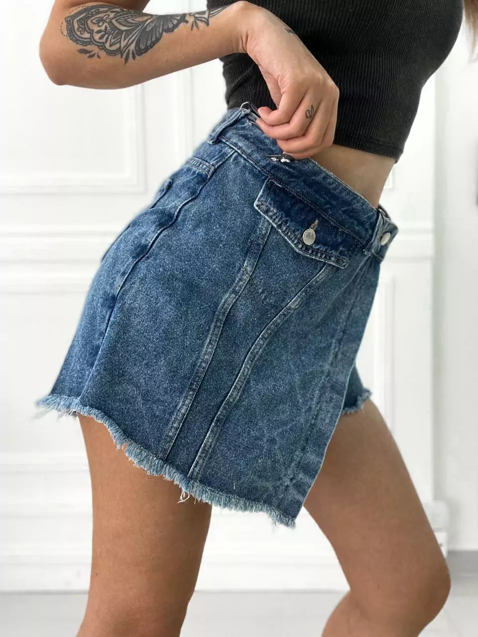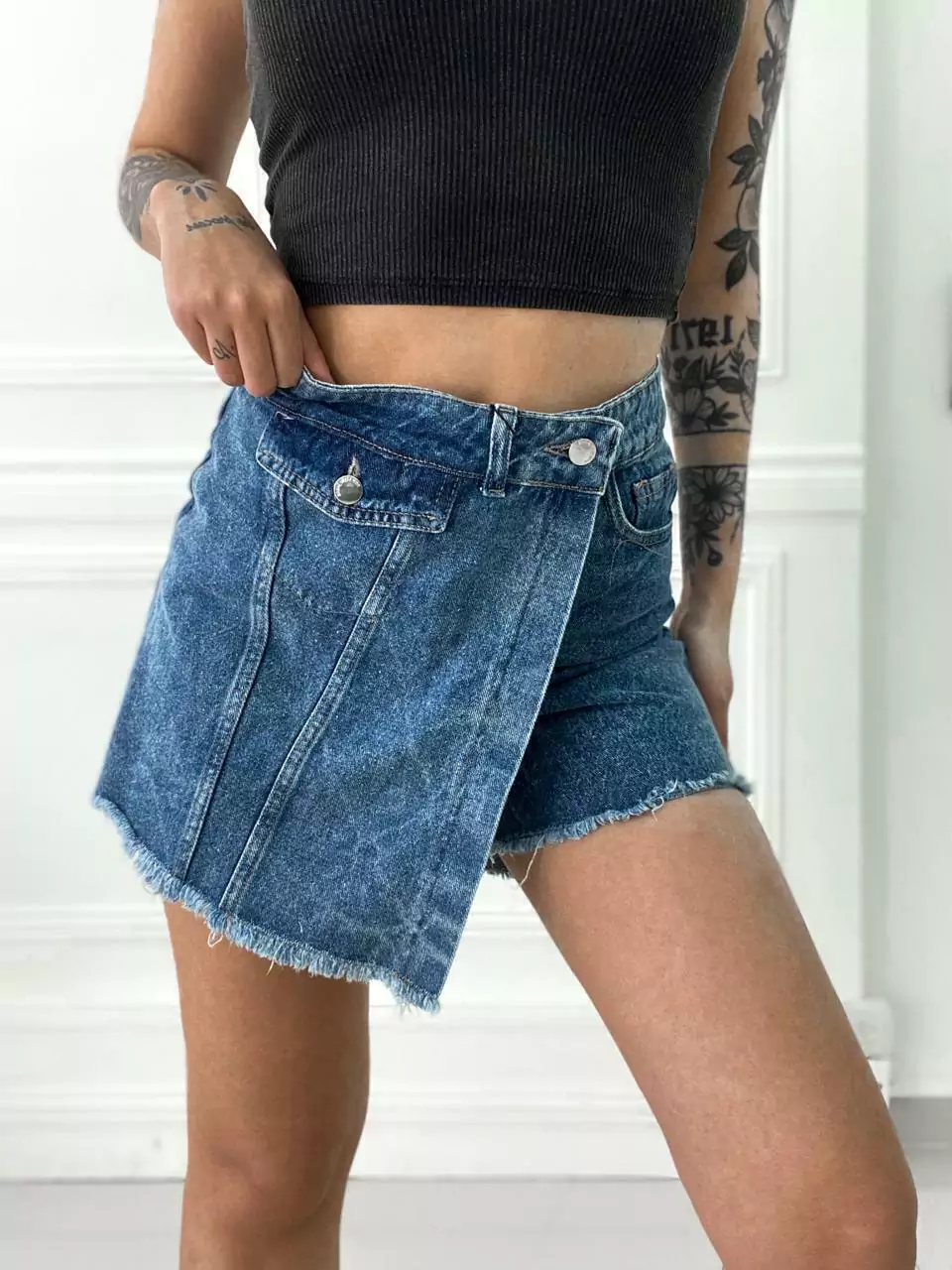 La Mini Skort EMBRUJO de jean rígido tiro alto combina estilo y practicidad en una sola prenda. Su diseño moderno fusiona la actitud de una mini con la comodidad de un short. El clásico color denim es versátil y atemporal, ideal para realzar cualquier look.