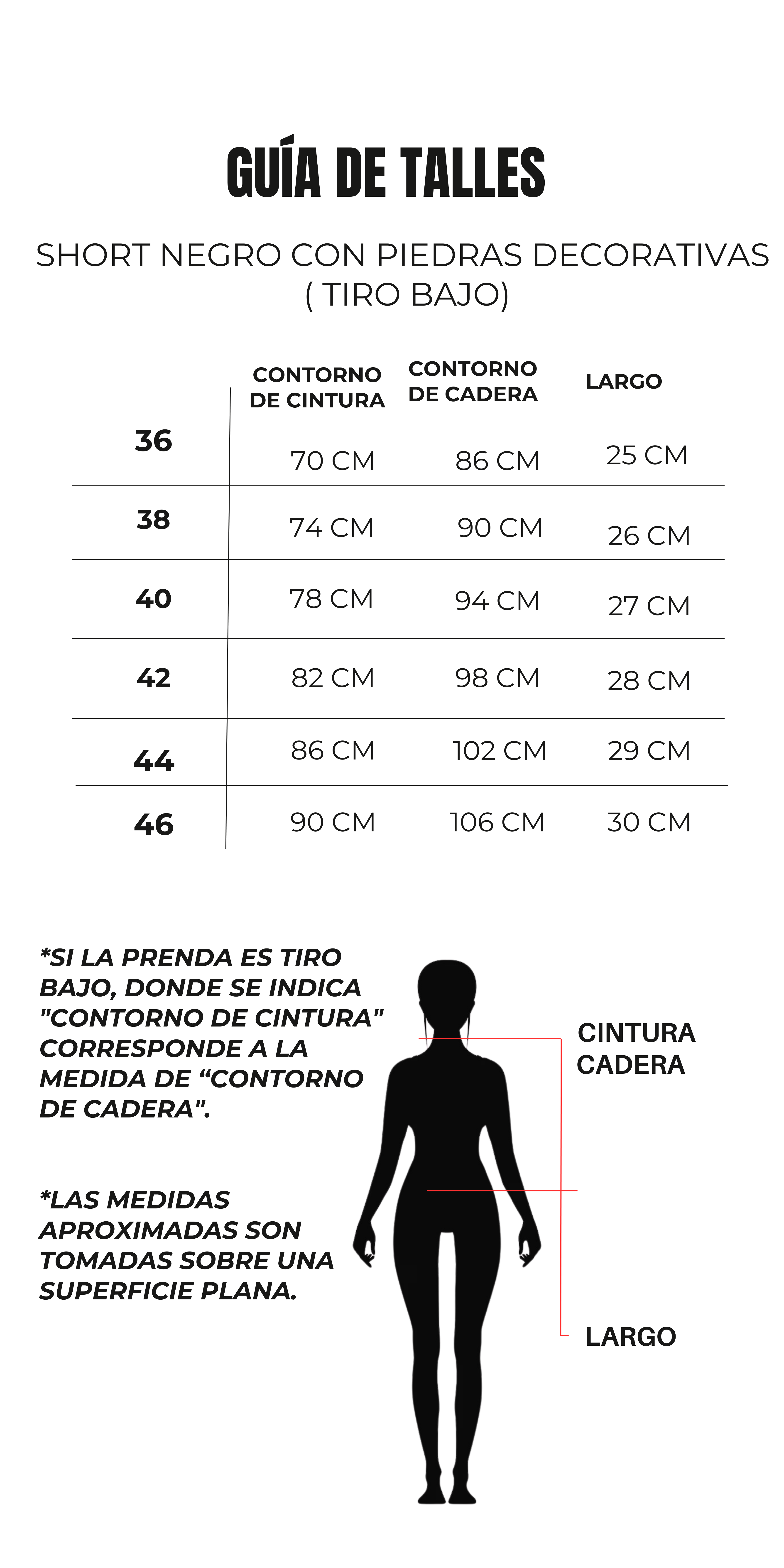 Short negro con piedras decorativas: confeccionado en denim rígido, aporta brillo y personalidad a tu look. Disponible en talles 36 al 46. Ideal para destacar en cualquier ocasión.