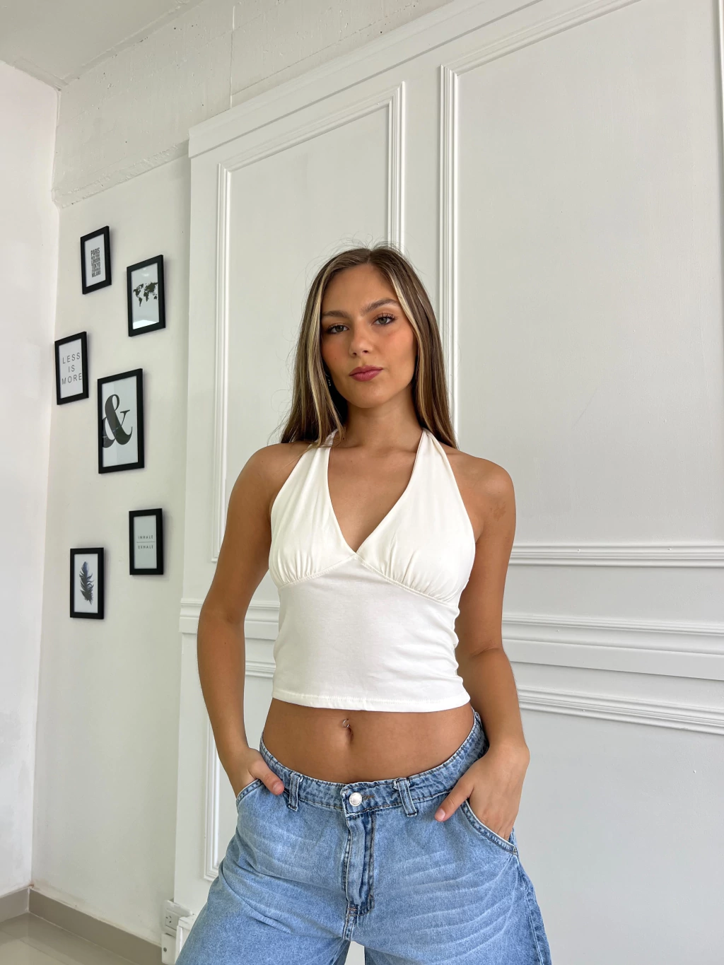 Top Cuello Halter para atar de Morley: cómodo, versátil y fácil de ajustar. Disponible en talles S al L y en colores gris, negro, blanco y marrón claro. Ideal para combinar y sumar estilo a cualquier look.
